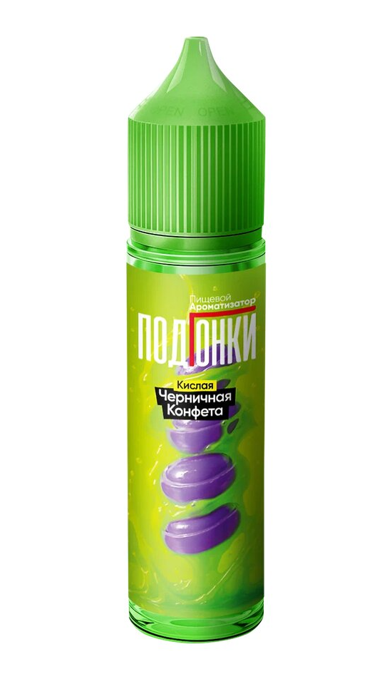 PODONKI ПОДГОНКИ Кислая черничная конфета - ароматизатор для вейпа в объёме 13 мл. Для получения готовой для использования жидкости нужно добавить только глицерин (VG).
