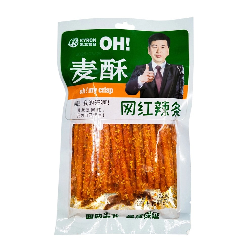 Mianjinwangye Maisu - пряный снек весом 172 гр. Производится в Китае из пшеницы и сои с добавлением специй, острого перца чили, семян кунжута и масла для яркого вкуса и аромата. В отличие от воздушных хрустящих чипсов, латяо имеют мягкую, тягучую и жевательную текстуру.