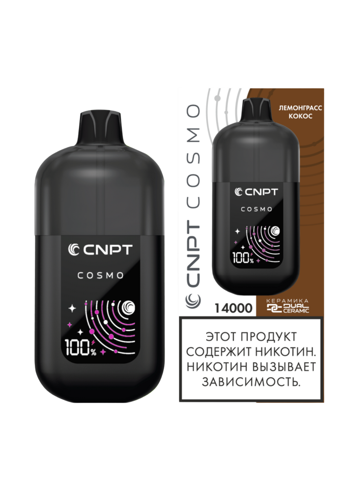 Одноразка CNPT COSMO Лемонграсс Кокос рассчитана на 14000 тяг. Корпус устройства выполнен в минималистичном дизайне из прочного пластика с soft-touch покрытием. Девайс оснащен уникальным двойным керамическим нагревателем DUAL CERAMIC и HD-экраном с анимацией процесса парения и заряда батареи. АКБ имеет ёмкость 780 mAh. В бак заправлено 15 мл жидкости.
