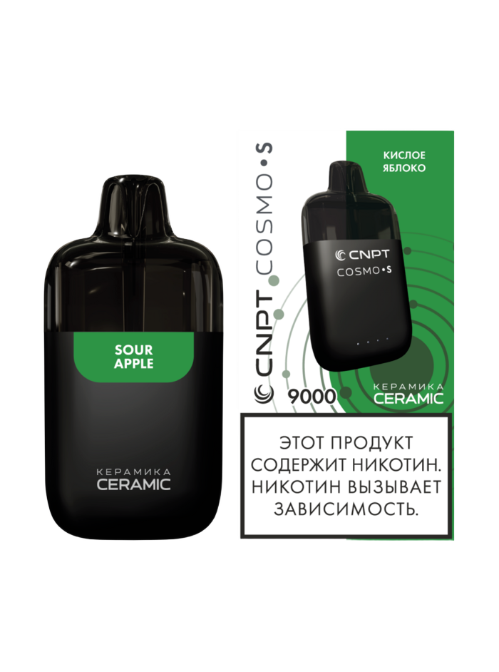 Одноразка CNPT COSMO S Кислое яблоко рассчитана на 9000 тяг. Корпус устройства выполнен в минималистичном дизайне из прочного пластика с soft-touch покрытием. Девайс оснащен LED-индикатором работы устройства. АКБ имеет ёмкость 500 mAh. В бак заправлено 9 мл жидкости.