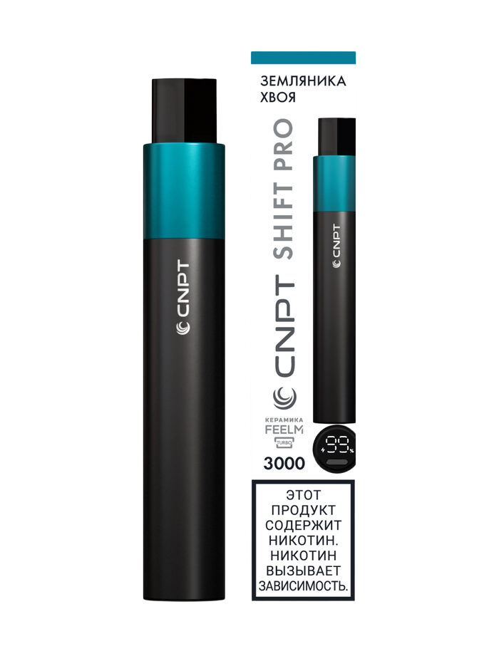 Одноразка CNPT SHIFT PRO - Земляника Хвоя рассчитана на 3000 тяг. Корпус девайса выполнен в форме стика и имеет строгий минималистичный дизайн. На нижней грани устройства расположен дисплей, отображающий уровень заряда и мощность. Девайс может работать в режиме Boost с увеличенной мощностью парения. Объем предзаправленной жидкости в баке составляет 5 мл. Встроенный АКБ на 650 mAh можно подзаряжать через USB Type-C.
