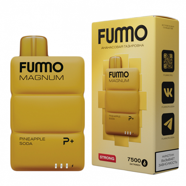 Одноразка FUMMO MAGNUM - Ананасовая газировка рассчитана на 7500 затяжек, что обеспечит 10 мл предзаправленной жижи в баке. Девайс имеет мощный аккумулятор - на 1600 mAh. Имитация металла и яркие цветовые акценты в дизайне корпуса придают устройству особый шарм.
