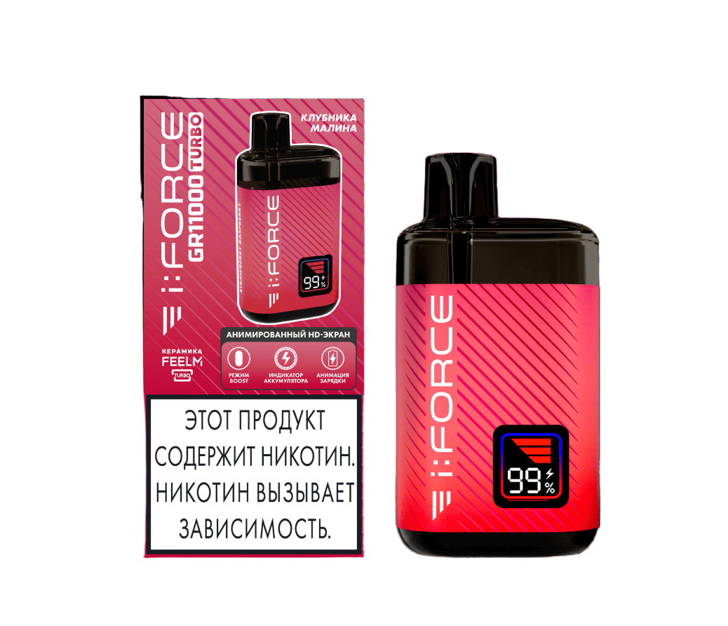 Одноразка i:FORCE GR11000 TURBO Клубника Малина рассчитана на 11000 затяжек. Корпус устройства выполнен в ярком дизайне. На лицевой стороне расположен LED-дисплей, отображающий уровень заряда и выбранный режим. Девайс может работать в режиме Boost с увеличенной мощностью парения. Объем предзаправленной жидкости в резервуаре составляет 12 мл.