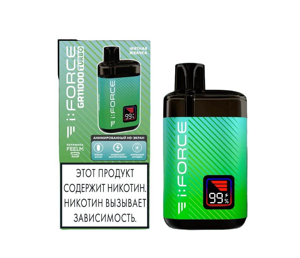 Одноразка i:FORCE GR11000 TURBO Мятная Жвачка рассчитана на 11000 затяжек. Корпус устройства выполнен в ярком дизайне. На лицевой стороне расположен LED-дисплей, отображающий уровень заряда и выбранный режим. Девайс может работать в режиме Boost с увеличенной мощностью парения. Объем предзаправленной жидкости в резервуаре составляет 12 мл.
