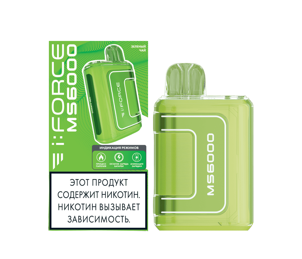 Одноразка i:FORCE MS6000 Зеленый Чай рассчитана на 6000 тяг. Корпус устройства выполнен в ярком и броском дизайне. На нижней грани девайса расположены LED-индикаторы процесса работы и уровня заряда. Объем предзаправленной жидкости в баке составляет 6 мл. Встроенный АКБ на 550 mAh можно подзаряжать через USB Type-C.