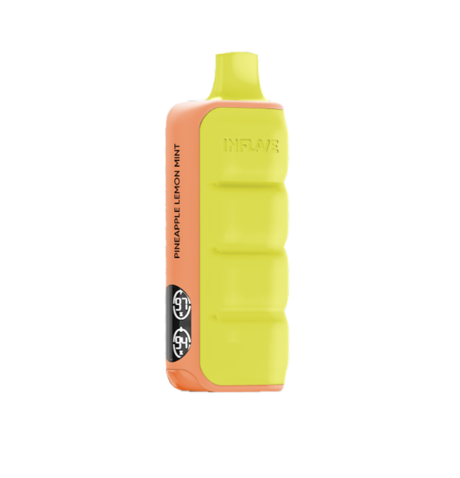 INFLAVE FLEX Ананас Лимон - одноразка с ярким дизайном, которая рассчитана на 12000 тяг. Корпус девайса имеет мягкое и тактильно приятное силиконовое покрытие. В soft-touch участки добавлен люминофор, который способен накапливать свет и излучать его в темноте. На боковой грани расположен дисплей, отображающий актуальный уровень заряда и оставшейся жидкости. АКБ имеет ёмкость 650 mAh и возможность быстрой зарядки через USB Type-C.