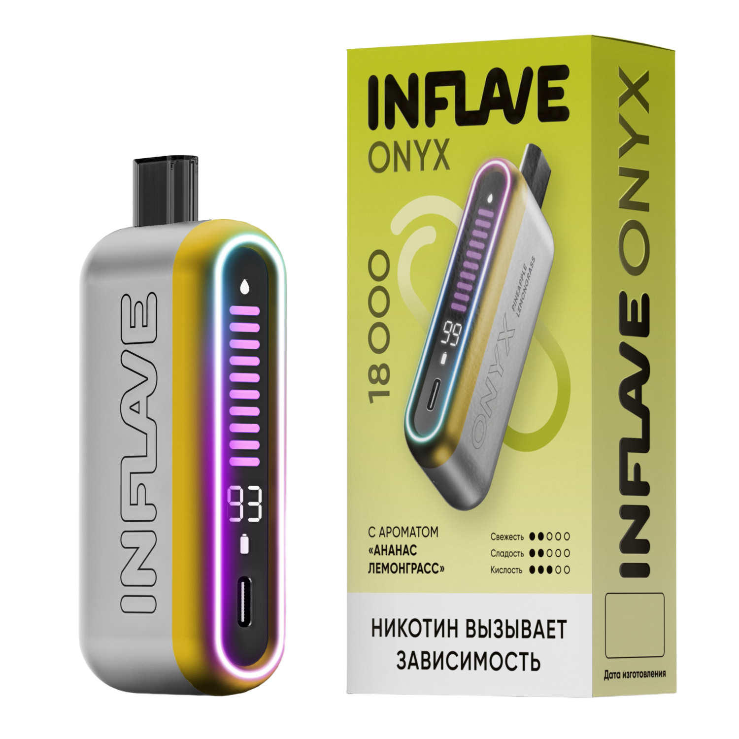 Одноразка INFLAVE ONYX Ананас Лемонграсс рассчитана на 18000 затяжек. Корпус девайса выполнен из алюминия в футуристичном дизайне со светодиодной кольцевой подсветкой. На боковой грани размещён дисплей, который отображает уровень заряда аккумулятора и остаток жидкости. Встроенный АКБ ёмкостью 650 mAh имеет возможность быстрой и удобной зарядки через USB Type-C. В бак заправлено 16 мл жижи.