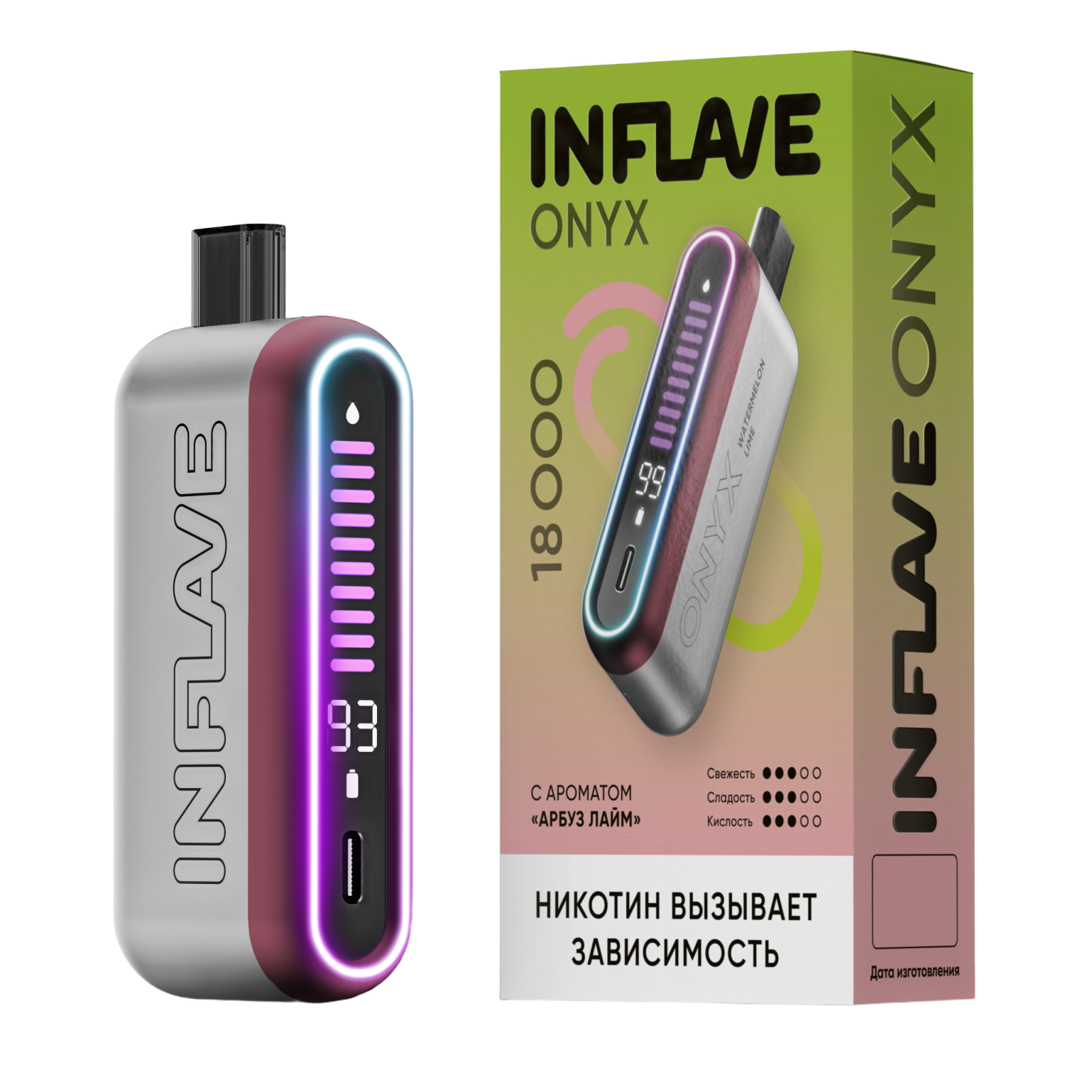 Одноразка INFLAVE ONYX Арбуз Лайм рассчитана на 18000 затяжек. Корпус девайса выполнен из алюминия в футуристичном дизайне со светодиодной кольцевой подсветкой. На боковой грани размещён дисплей, который отображает уровень заряда аккумулятора и остаток жидкости. Встроенный АКБ ёмкостью 650 mAh имеет возможность быстрой и удобной зарядки через USB Type-C. В бак заправлено 16 мл жижи.
