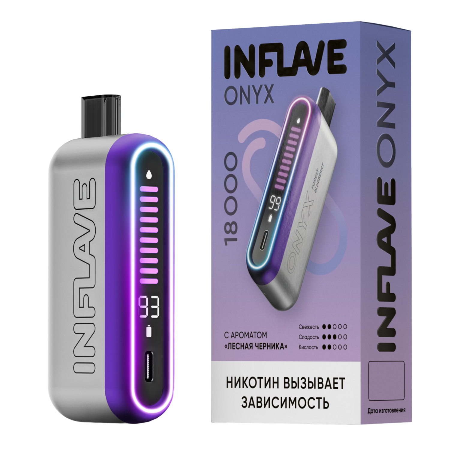 Одноразка INFLAVE ONYX Лесная черника рассчитана на 18000 затяжек. Корпус девайса выполнен из алюминия в футуристичном дизайне со светодиодной кольцевой подсветкой. На боковой грани размещён дисплей, который отображает уровень заряда аккумулятора и остаток жидкости. Встроенный АКБ ёмкостью 650 mAh имеет возможность быстрой и удобной зарядки через USB Type-C. В бак заправлено 16 мл жижи.