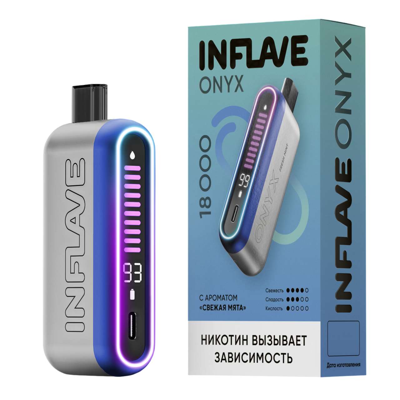 Одноразка INFLAVE ONYX Свежая мята рассчитана на 18000 затяжек. Корпус девайса выполнен из алюминия в футуристичном дизайне со светодиодной кольцевой подсветкой. На боковой грани размещён дисплей, который отображает уровень заряда аккумулятора и остаток жидкости. Встроенный АКБ ёмкостью 650 mAh имеет возможность быстрой и удобной зарядки через USB Type-C. В бак заправлено 16 мл жижи.
