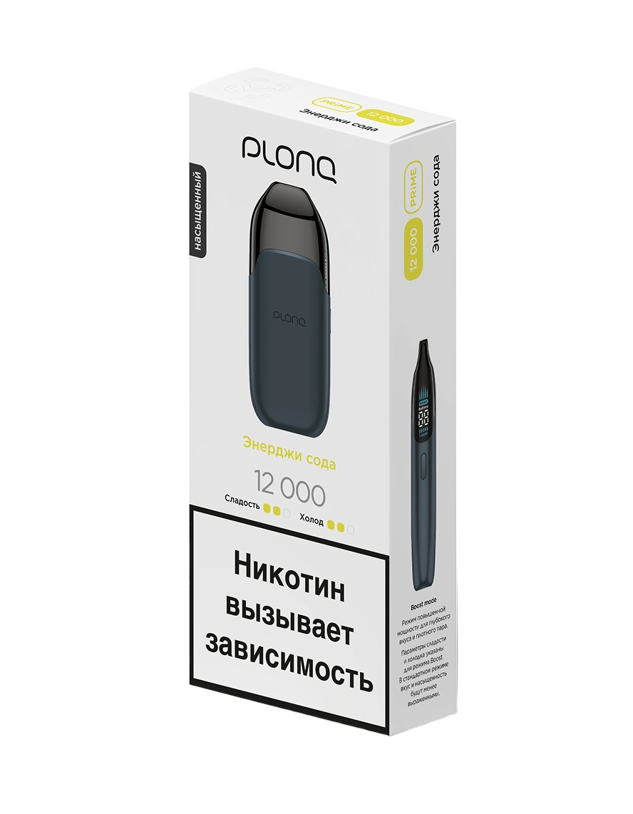 Одноразка PLONQ Prime Энерджи Сода рассчитана на 12000 тяг. Устройство имеет тонкий металлический корпус с плавными линиями. LED-экран интегрирован в боковую часть устройства и отображает уровень жидкости, заряд батареи и выбранный режим. Девайс включается двойным нажатием кнопки. Одинарное нажатие активирует экран и переключает работу устройства в режим Boost. Встроенный АКБ имеет ёмкость 750 mAh. В бак предзаправлено 14 мл жидкости.