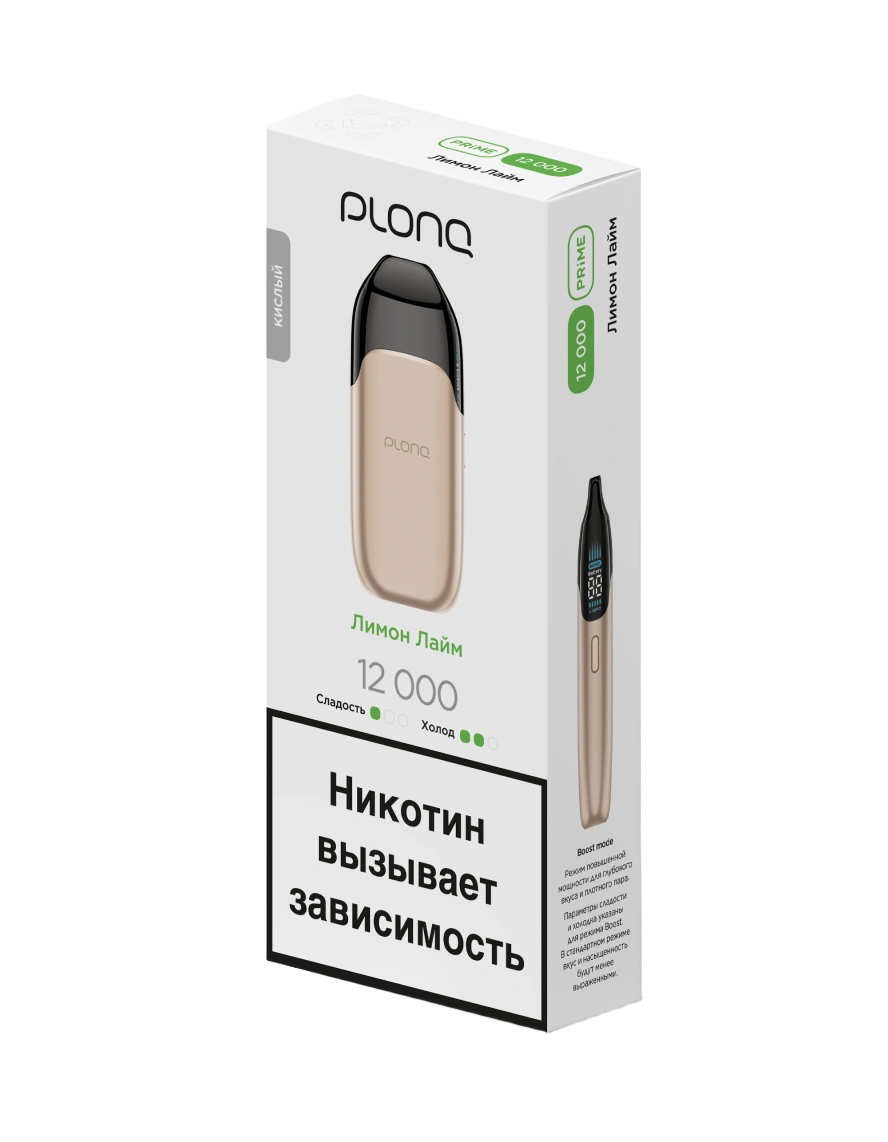 Одноразка PLONQ Prime Лимон Лайм рассчитана на 12000 тяг. Устройство имеет тонкий металлический корпус с плавными линиями. LED-экран интегрирован в боковую часть устройства и отображает уровень жидкости, заряд батареи и выбранный режим. Девайс включается двойным нажатием кнопки. Одинарное нажатие активирует экран и переключает работу устройства в режим Boost. Встроенный АКБ имеет ёмкость 750 mAh. В бак предзаправлено 14 мл жидкости.