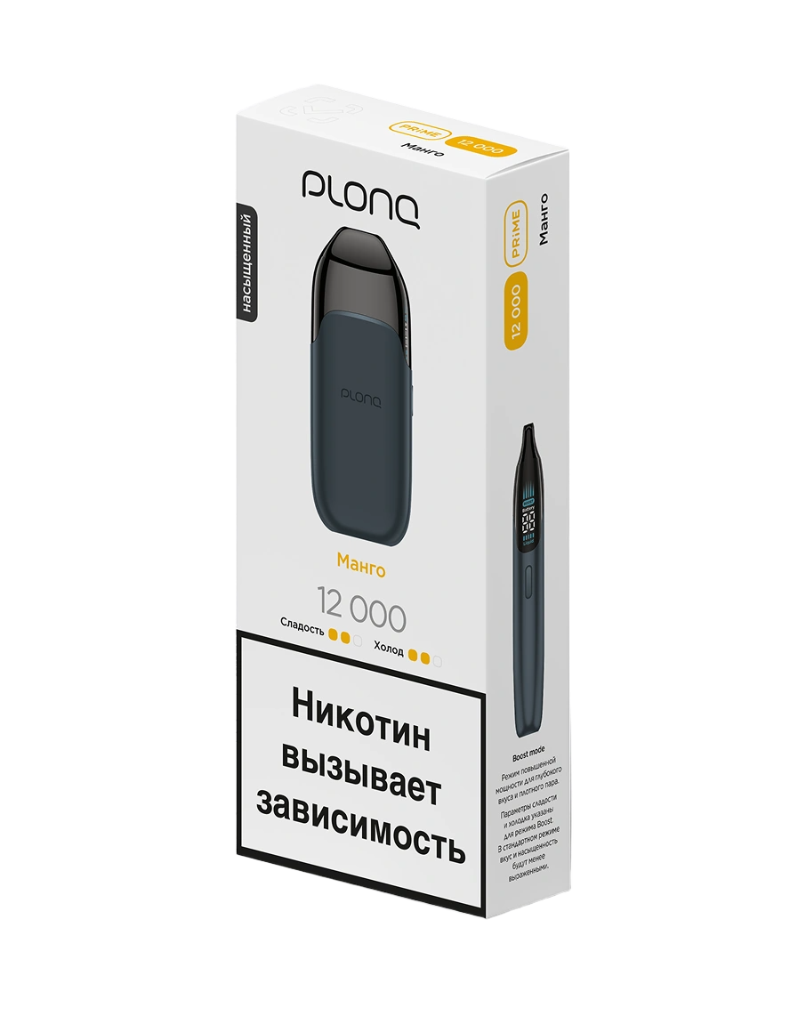 Одноразка PLONQ Prime Манго рассчитана на 12000 тяг. Устройство имеет тонкий металлический корпус с плавными линиями. LED-экран интегрирован в боковую часть устройства и отображает уровень жидкости, заряд батареи и выбранный режим. Девайс включается двойным нажатием кнопки. Одинарное нажатие активирует экран и переключает работу устройства в режим Boost. Встроенный АКБ имеет ёмкость 750 mAh. В бак предзаправлено 14 мл жидкости.