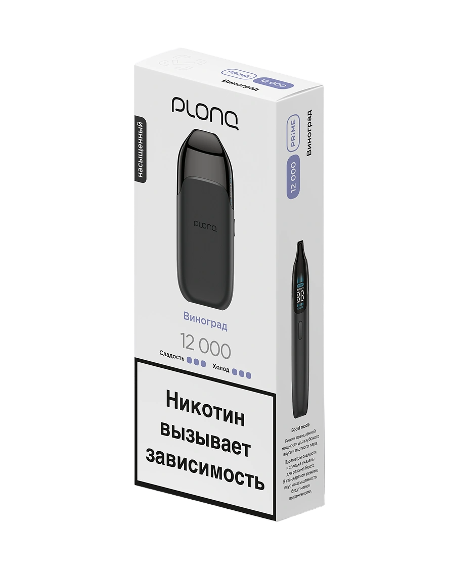 Одноразка PLONQ Prime Виноград рассчитана на 12000 тяг. Устройство имеет тонкий металлический корпус с плавными линиями. LED-экран интегрирован в боковую часть устройства и отображает уровень жидкости, заряд батареи и выбранный режим. Девайс включается двойным нажатием кнопки. Одинарное нажатие активирует экран и переключает работу устройства в режим Boost. Встроенный АКБ имеет ёмкость 750 mAh. В бак предзаправлено 14 мл жидкости.