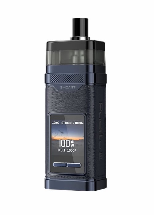 Smoant Pasito 3 Blue Nuit - мощная POD-система, которая способна выдавать 100 Вт. Материалами корпуса служат цинковый сплав, пластик и тактильно приятная накладка из экокожи. Девайс работает в четырёх режимах: Strong, Norm, Soft и DVW. Устройство оснащено TFT-экраном на 1.3 дюйма, который отображает время работы, уровень заряда, мощность, сопротивление и режим работы. В целом же предусмотрена 3 темы оформления и 24 варианта обоев экрана на любой вкус. В бак ПОДа возможно заправить 7 мл жидкости. Ёмкий аккумулятор на 2800 mAh заряжается всего за 30 минут через USB Type-C.