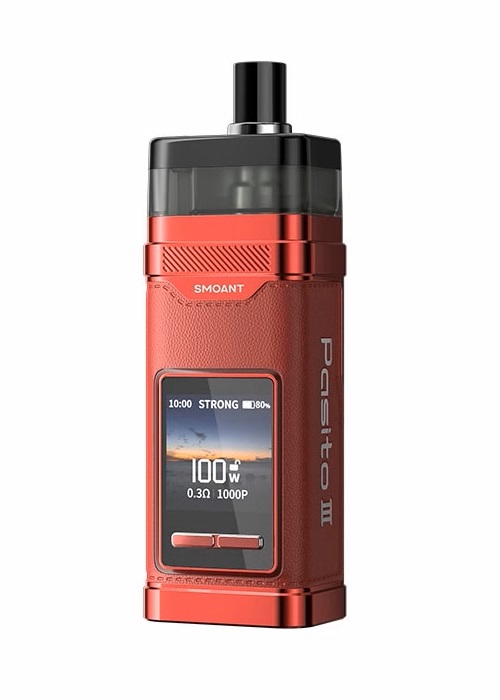 Smoant Pasito 3 Classical Red - мощная POD-система, которая способна выдавать 100 Вт. Материалами корпуса служат цинковый сплав, пластик и тактильно приятная накладка из экокожи. Девайс работает в четырёх режимах: Strong, Norm, Soft и DVW. Устройство оснащено TFT-экраном на 1.3 дюйма, который отображает время работы, уровень заряда, мощность, сопротивление и режим работы. В целом же предусмотрена 3 темы оформления и 24 варианта обоев экрана на любой вкус. В бак ПОДа возможно заправить 7 мл жидкости. Ёмкий аккумулятор на 2800 mAh заряжается всего за 30 минут через USB Type-C.